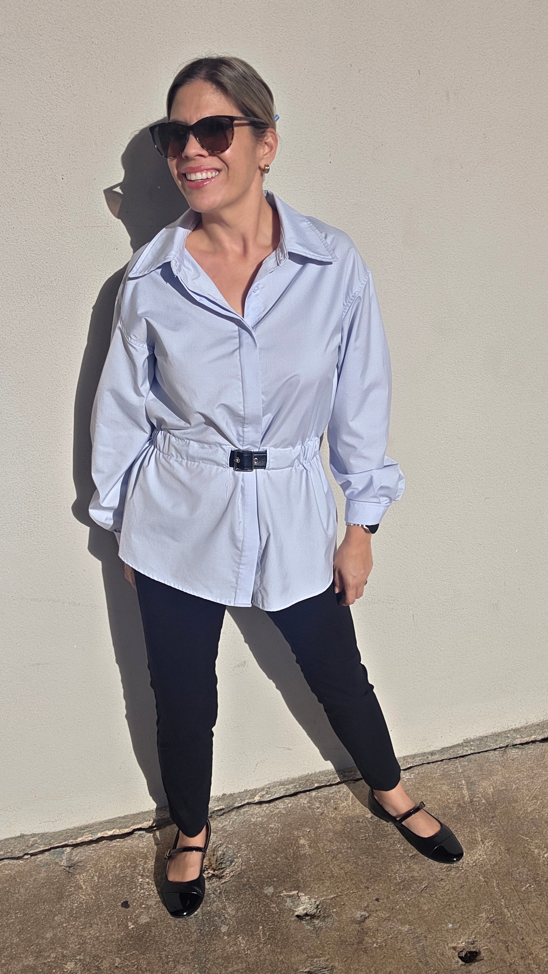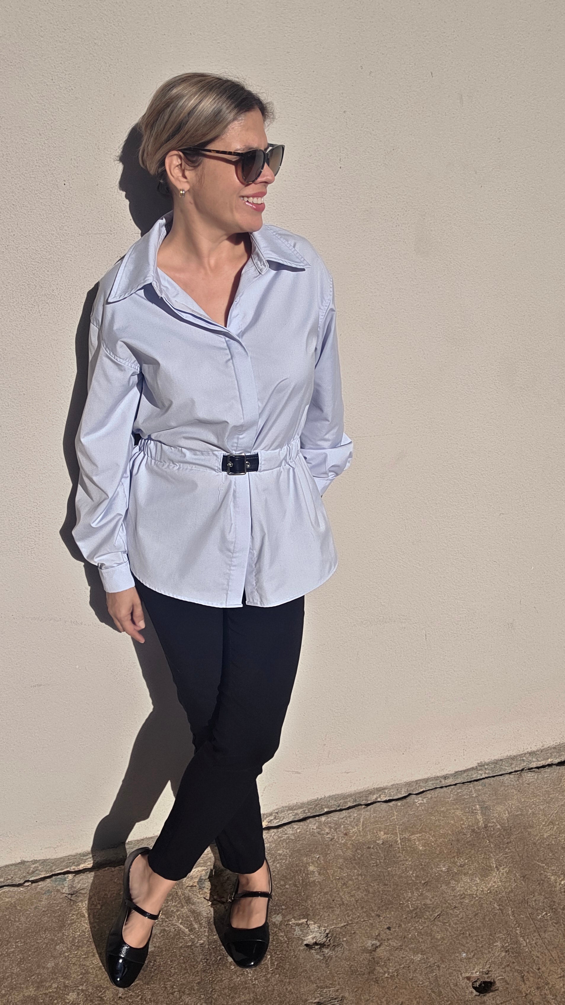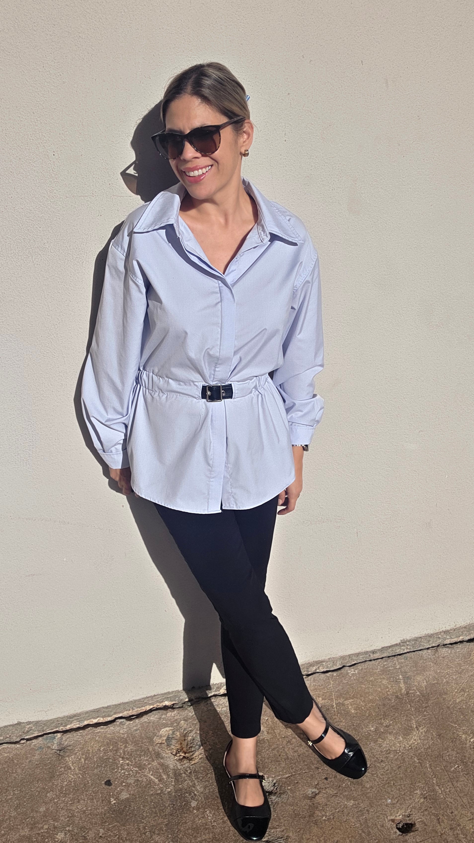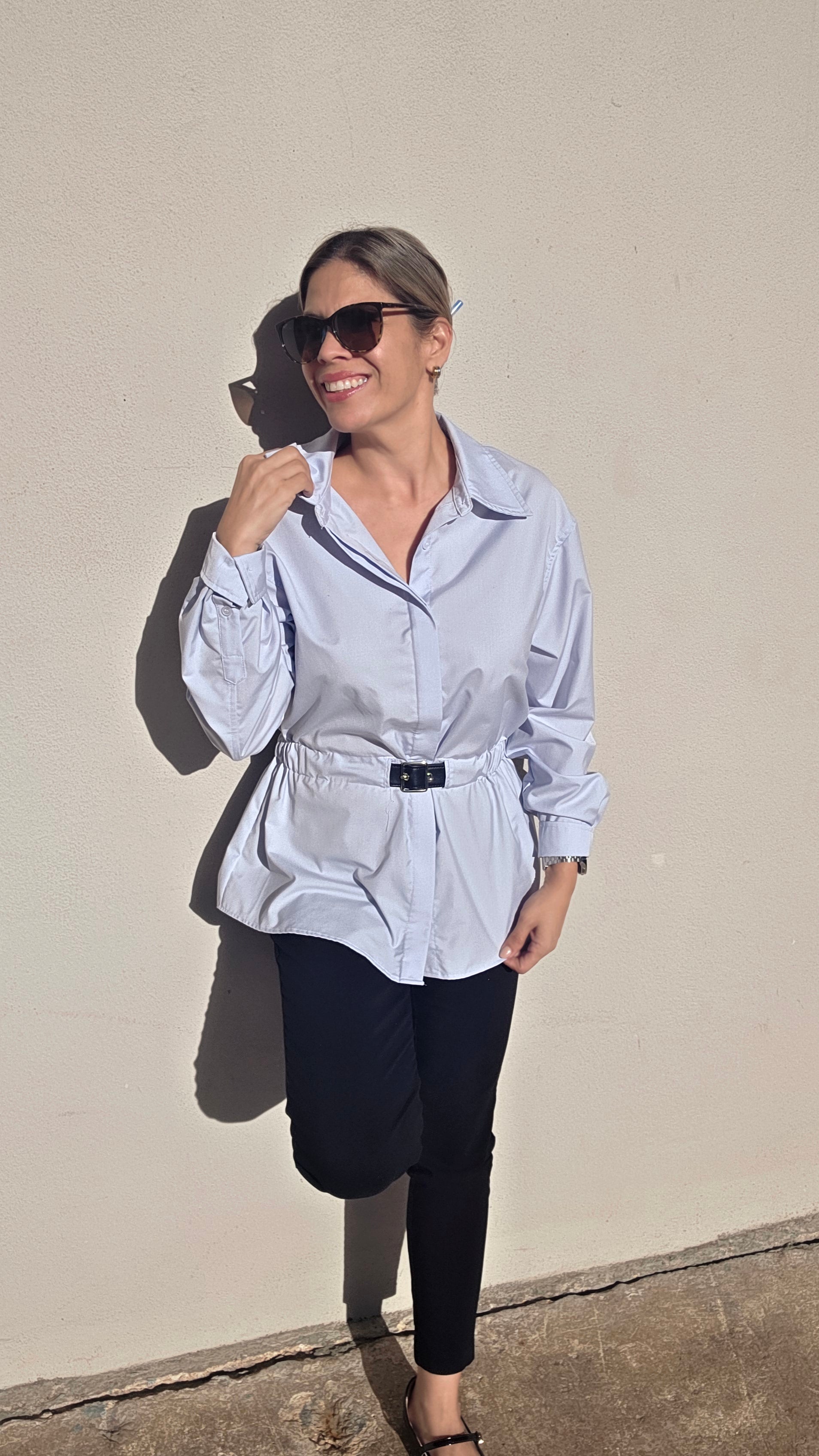 Elevate your wardrobe with this refined poplin button-down shirt, featuring a sleek PU waist belt that defines your silhouette with subtle elegance. Crafted from smooth, breathable fabric, it offers a polished look perfect for both professional settings and stylish outings. The tailored fit and minimalist design ensure timeless sophistication and effortless versatility.