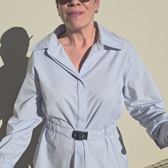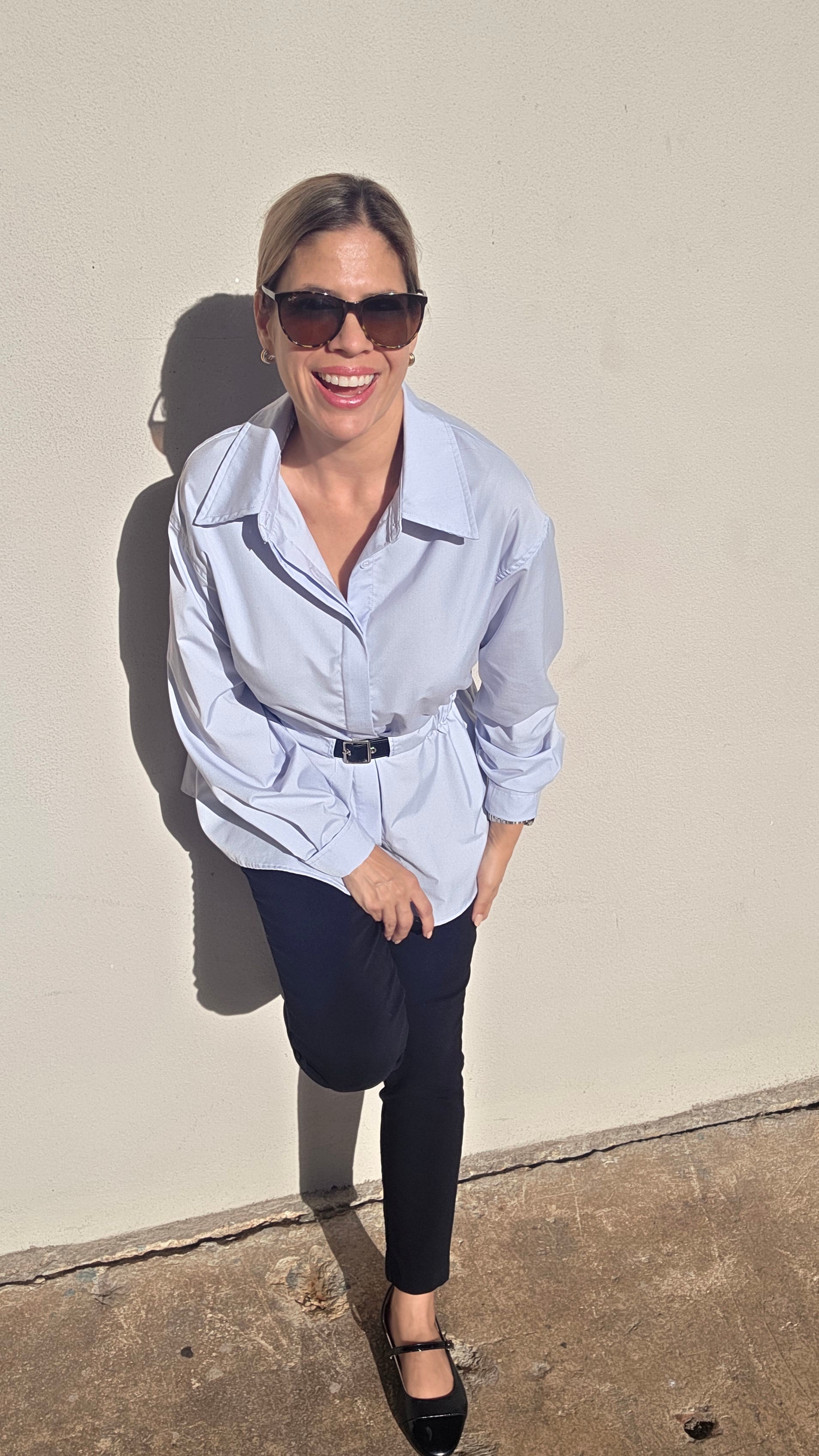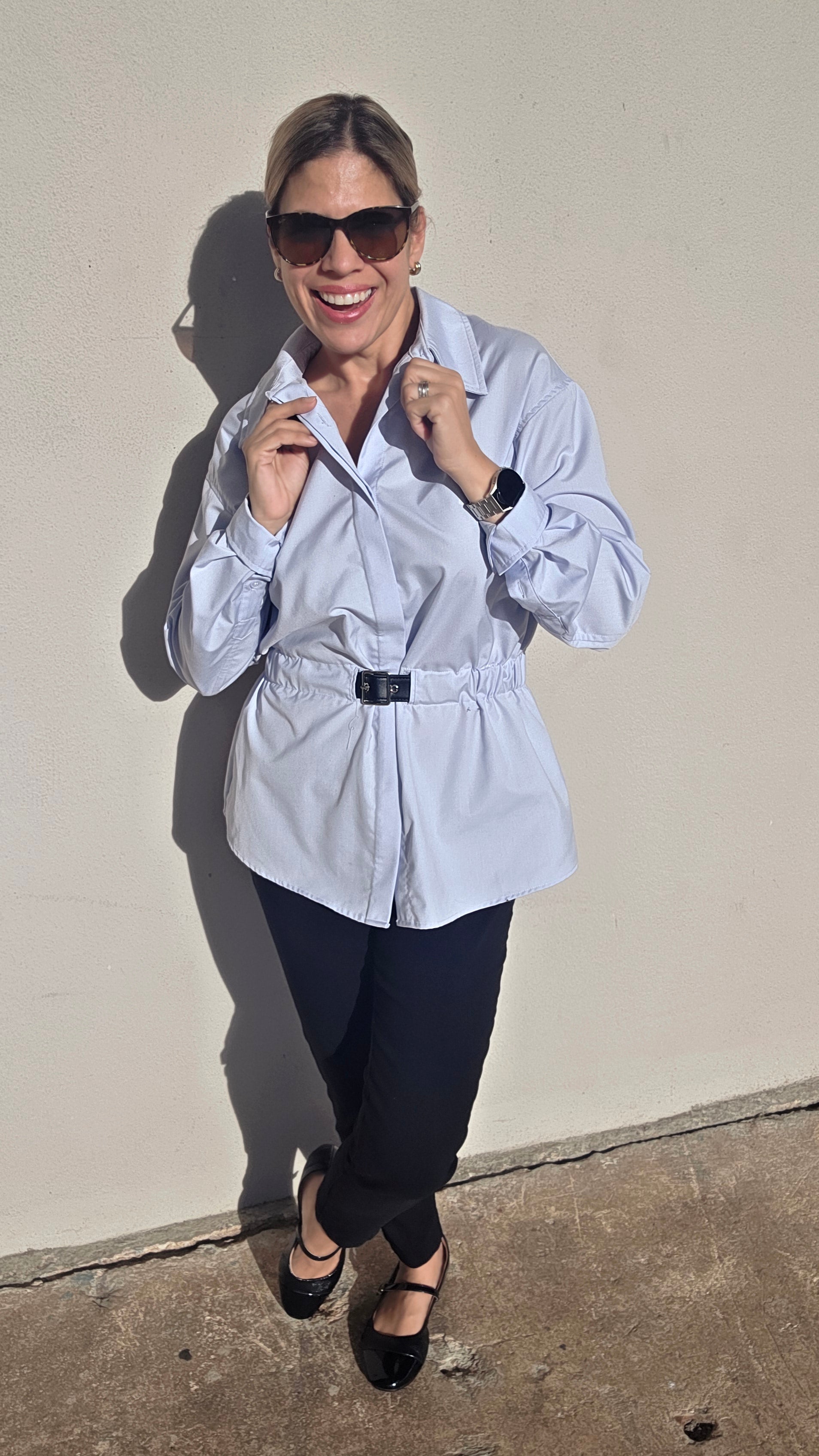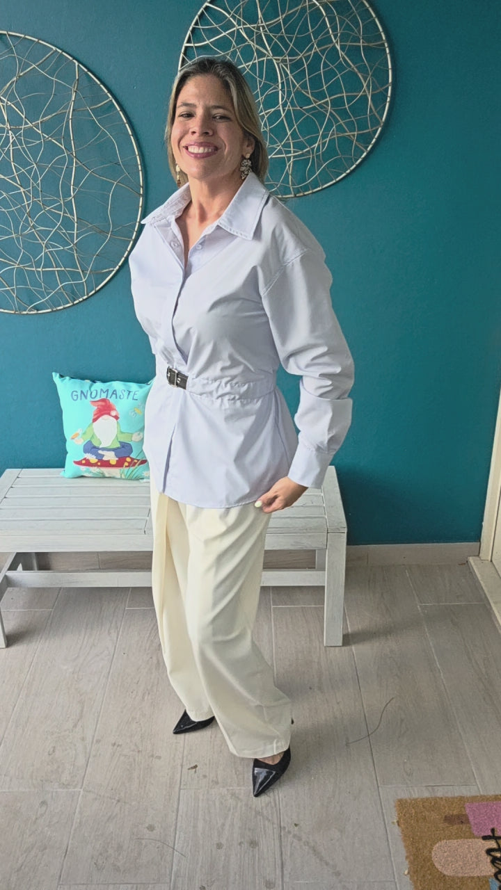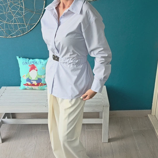 Elevate your wardrobe with this refined poplin button-down shirt, featuring a sleek PU waist belt that defines your silhouette with subtle elegance. Crafted from smooth, breathable fabric, it offers a polished look perfect for both professional settings and stylish outings. The tailored fit and minimalist design ensure timeless sophistication and effortless versatility.