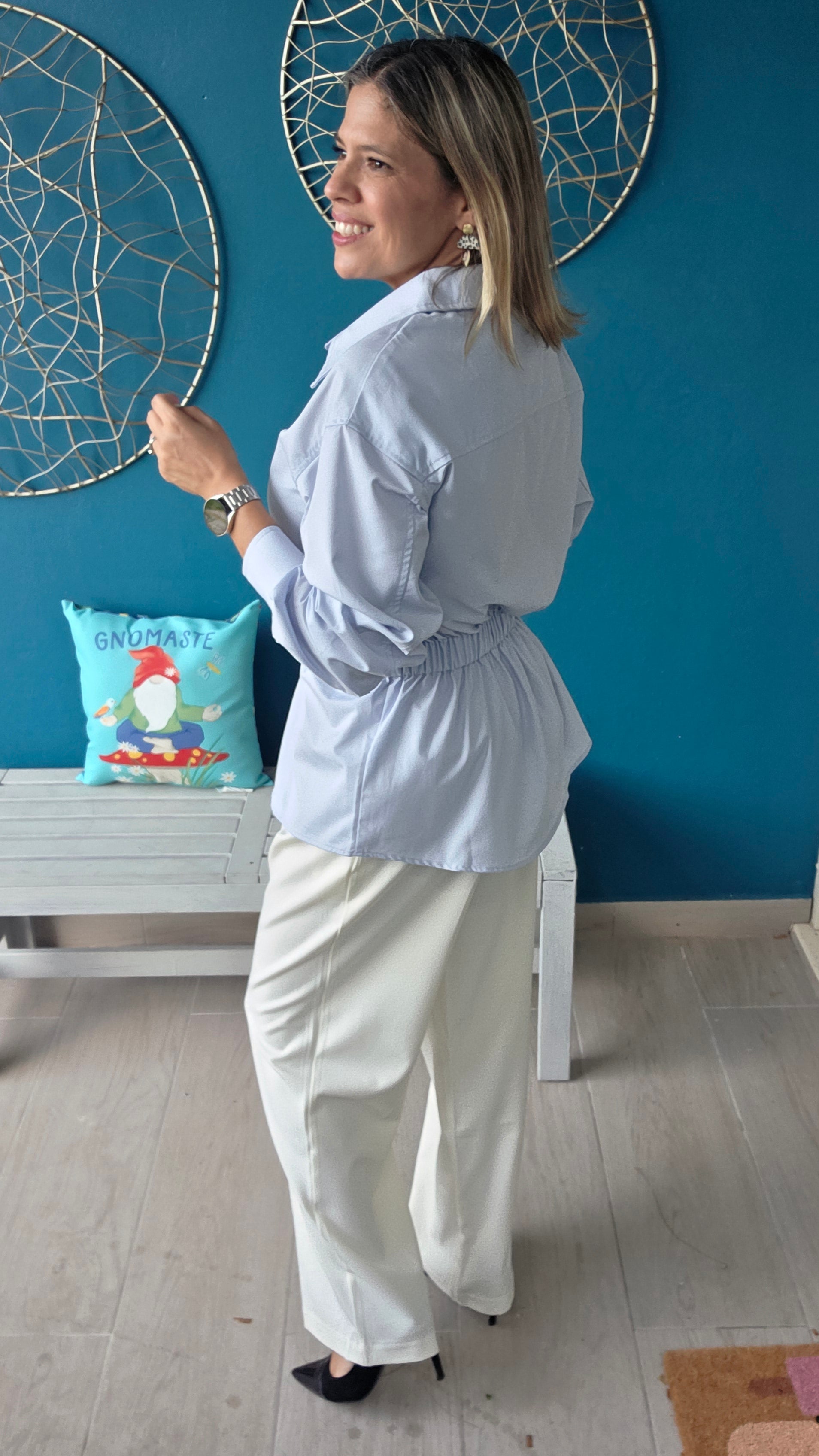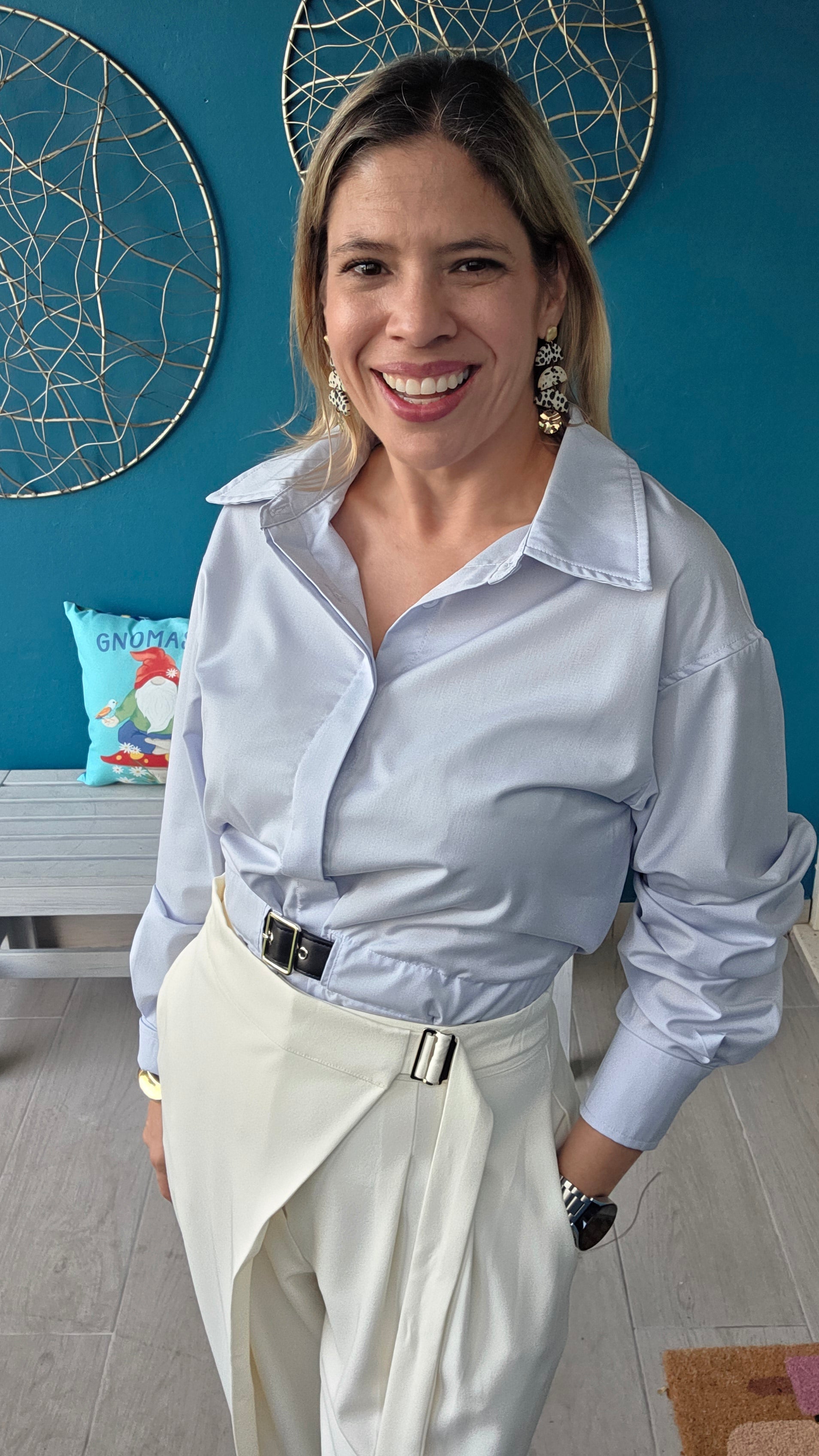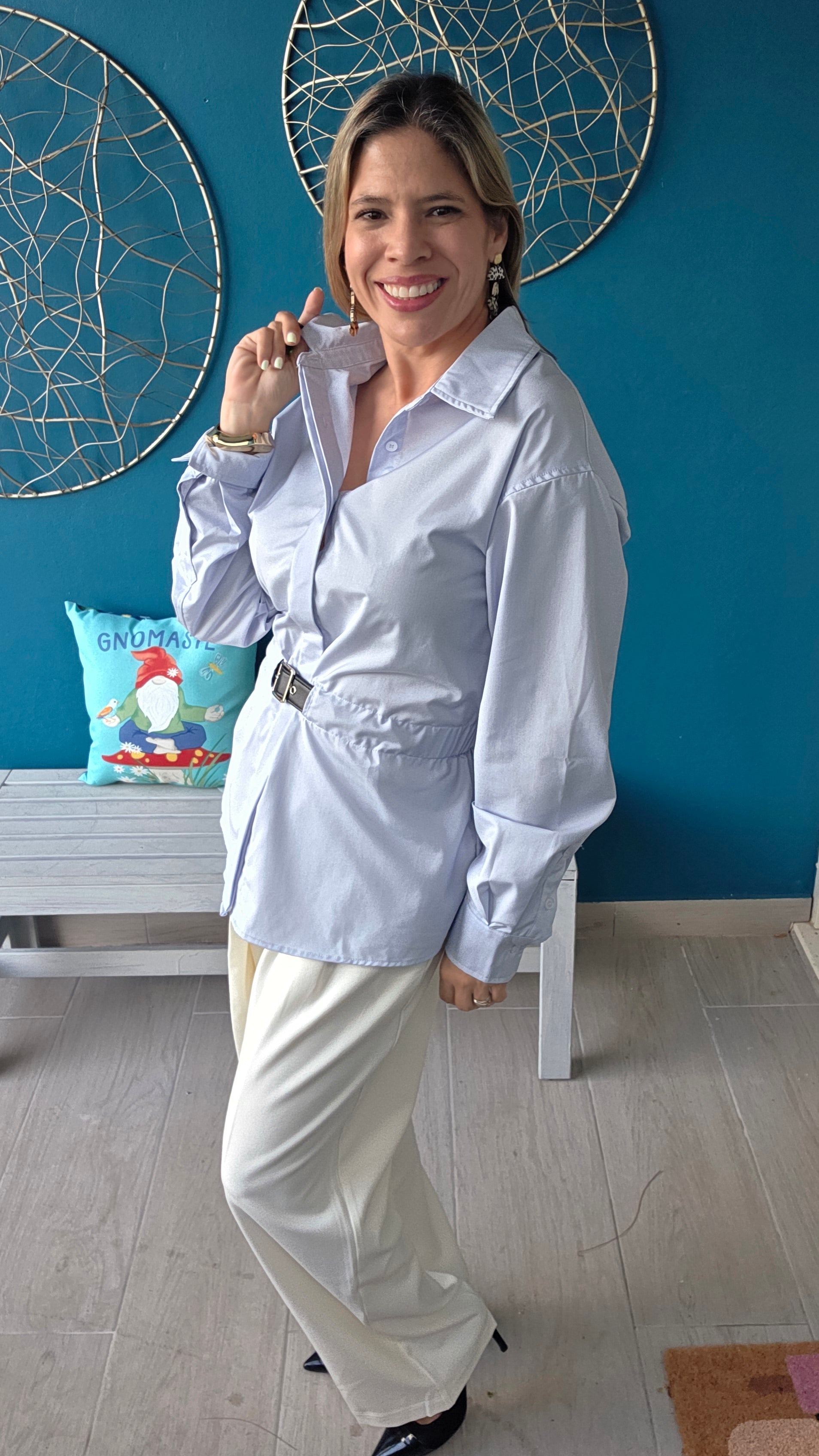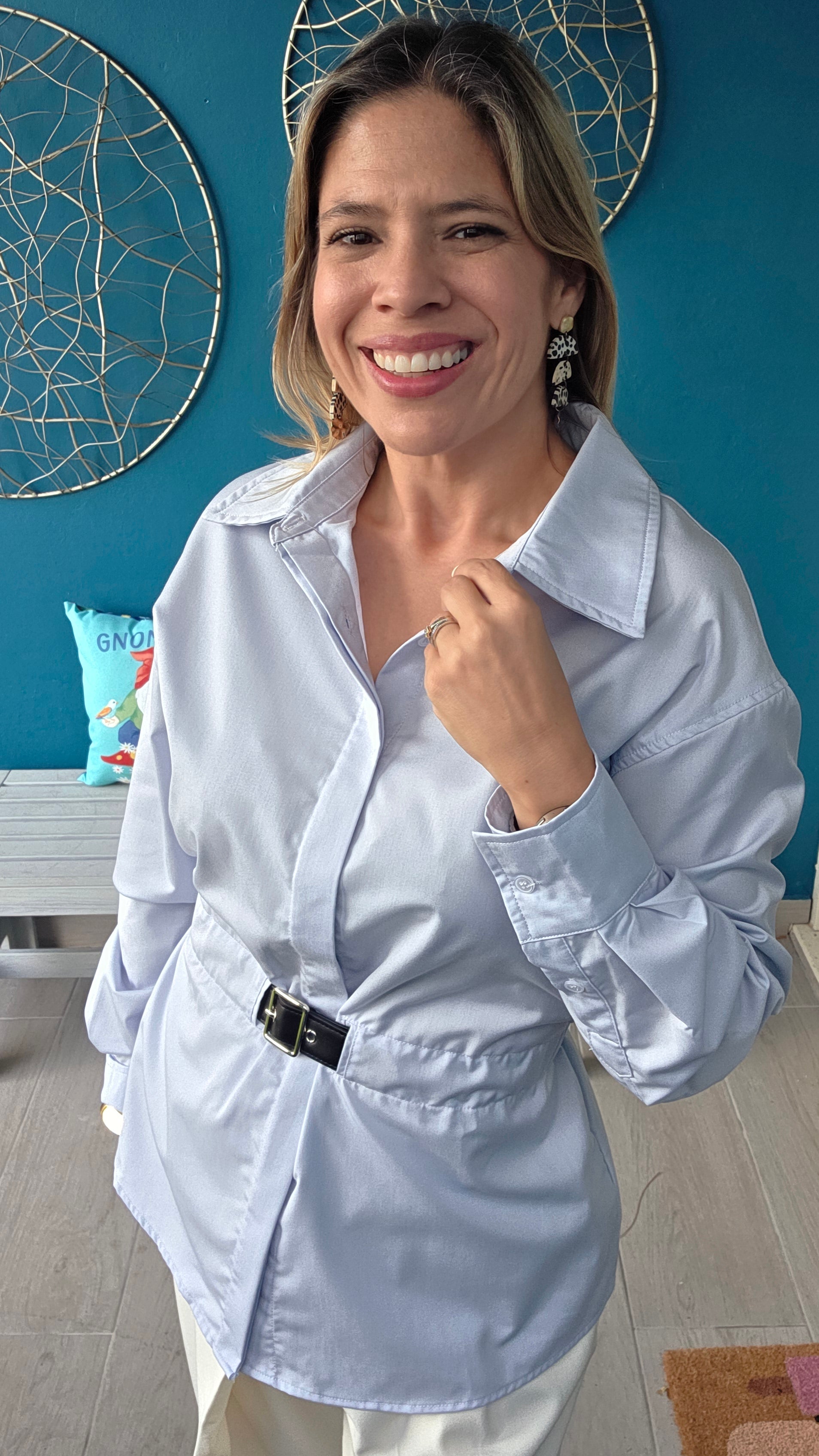 Elevate your wardrobe with this refined poplin button-down shirt, featuring a sleek PU waist belt that defines your silhouette with subtle elegance. Crafted from smooth, breathable fabric, it offers a polished look perfect for both professional settings and stylish outings. The tailored fit and minimalist design ensure timeless sophistication and effortless versatility.