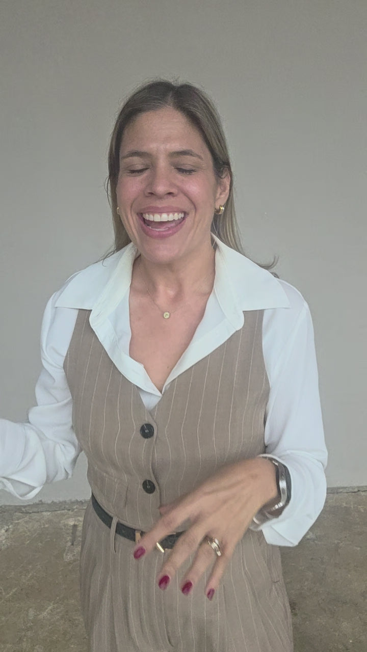 The Cardi Jumpsuit combines tailored elegance with comfort through its sleek pinstriped design and sleeveless silhouette. Featuring a refined V-neckline, button-up front with flap chest detail, and pleated front seams, it offers subtle sophistication. The partially elasticated back waistband and wide-leg bottoms ensure a flattering, relaxed fit, while practical belt loops and side hip pockets add functional style. Crafted from a polyester blend with rayon and spandex, it delivers lasting comfort and ease of movement for a polished, confident look.