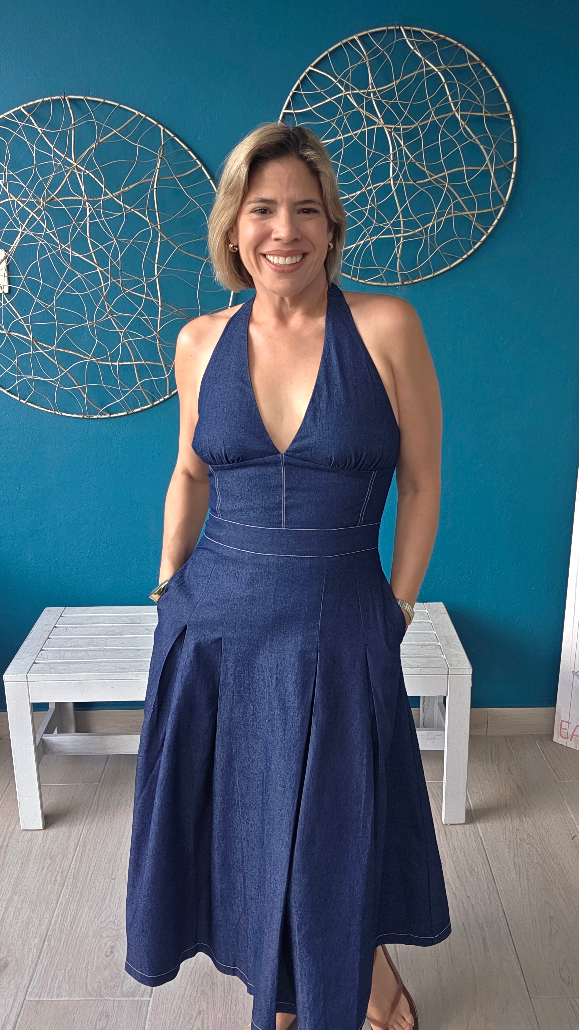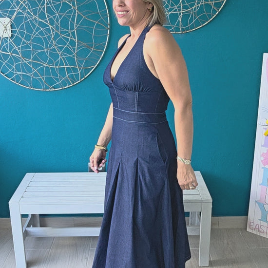 Timeless denim meets modern femininity in this halter midi dress. The plunging halter neckline elongates your silhouette while gathered bust detailing and defined seaming create a tailored, supportive fit. A full A-line skirt with soft pleating flows effortlessly from a shaped waistband, offering movement without bulk. Practical side pockets keep the design clean and minimal. Open back with halter strap closure. Midi length. Perfect for resort getaways, casual events, or elevated everyday wear.
