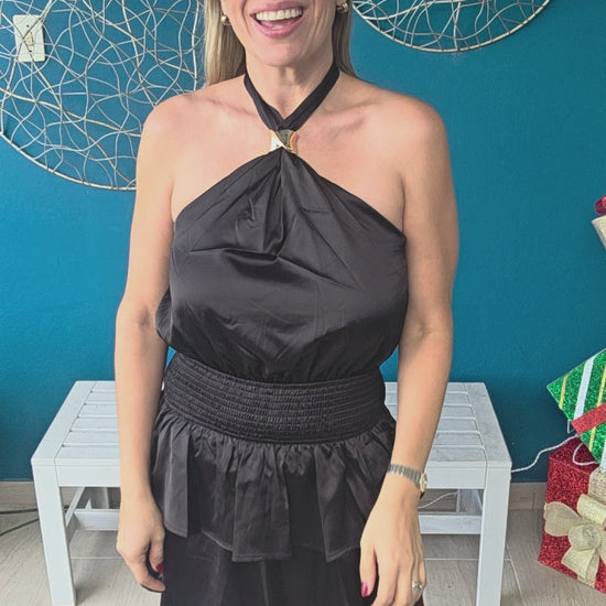 Chic and flirty, this halter mini dress transitions seamlessly from day to night with its silky drape and flattering silhouette. A metallic ring accent gathers the neckline while an elegant tie-back closure showcases the open back. The wide smocked waistband defines your shape, flowing into a tiered ruffle skirt that dances with every move. Lightweight and unlined, it's your go-to for parties, getaways, or spontaneous adventures—polished enough for special occasions, playful enough for everyday fun.