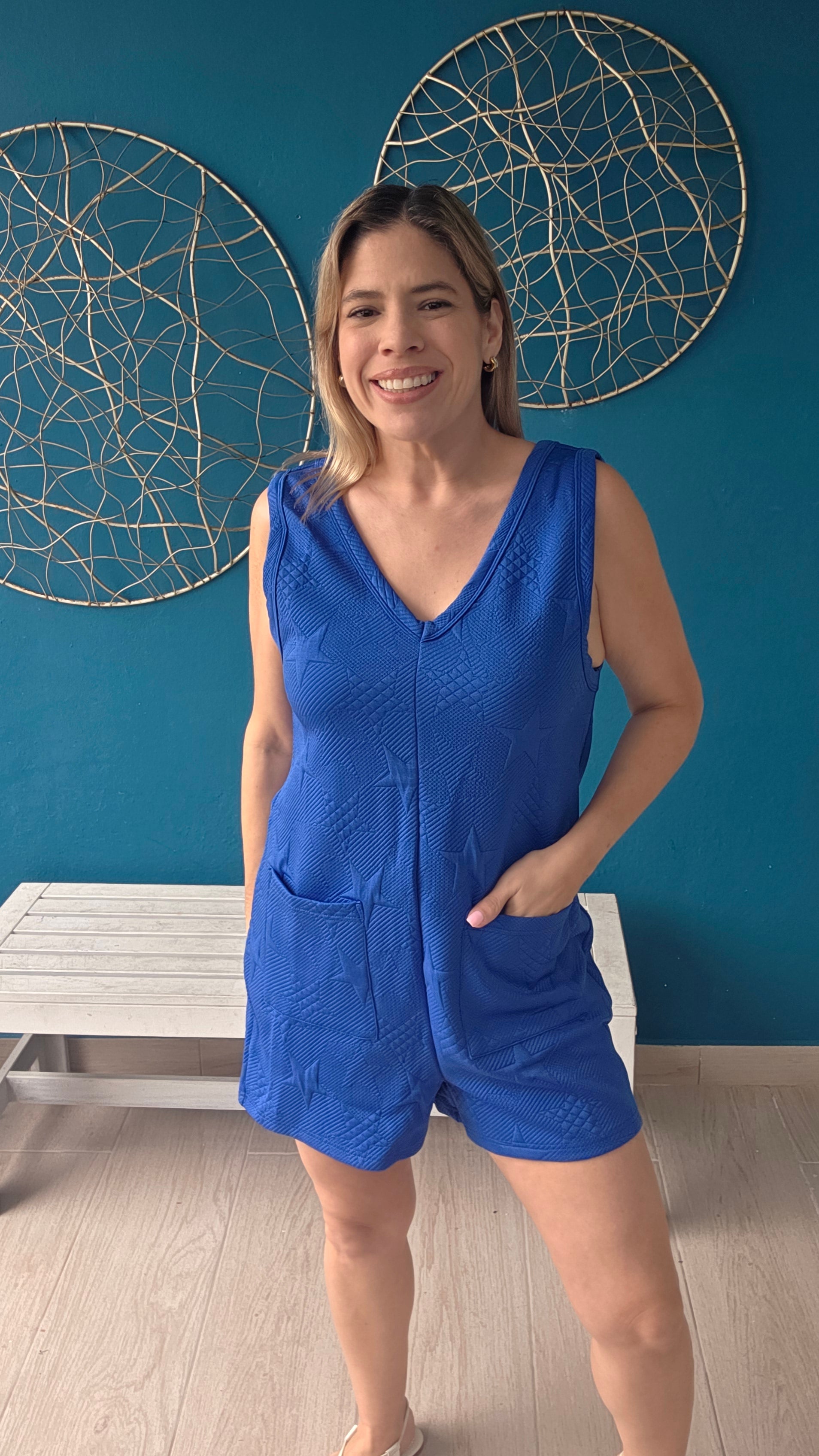 Effortlessly chic and oh-so-comfy, this Star V-neck Romper is your new go-to for laid-back style. The charming star embroidery adds a whimsical touch, while the flattering V-neckline with center seam detail keeps things interesting. Slip on the relaxed, loose fit and tuck your essentials into the two front pockets—because pockets make everything better. Perfect for casual outings, weekend adventures, or just vibing in style.