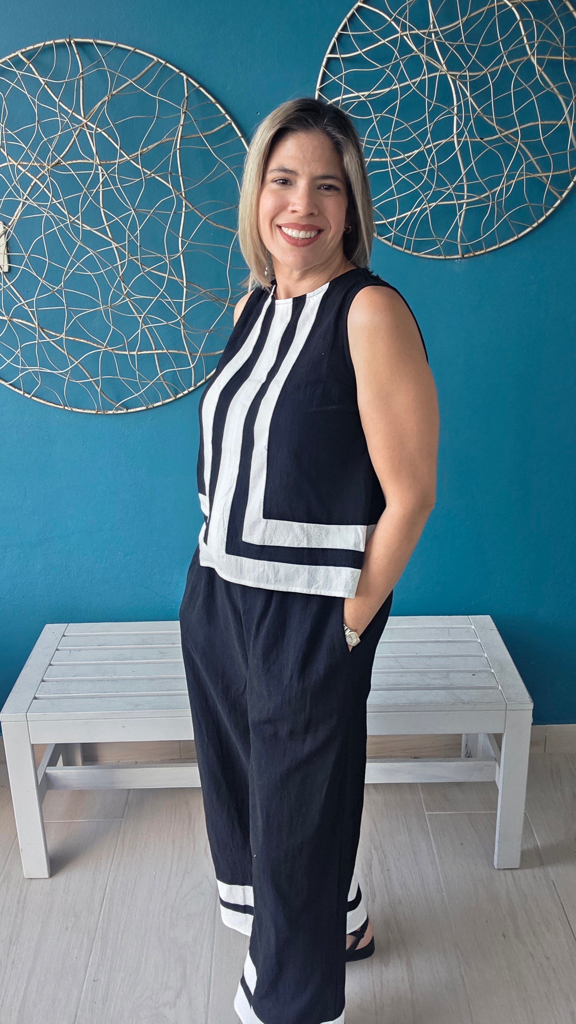 Elevate your everyday style with this linen blend tank and pants set, designed for effortless sophistication. The sleeveless tank features striking contrast trim accents and a keyhole neckline with button closure, while the cropped wide-leg pants offer a relaxed fit with an elasticized waist and adjustable drawstring. Perfect for warm weather dressing, this versatile two-piece set transitions seamlessly from casual outings to weekend gatherings. The breathable linen blend keeps you cool and comfortable all day long.