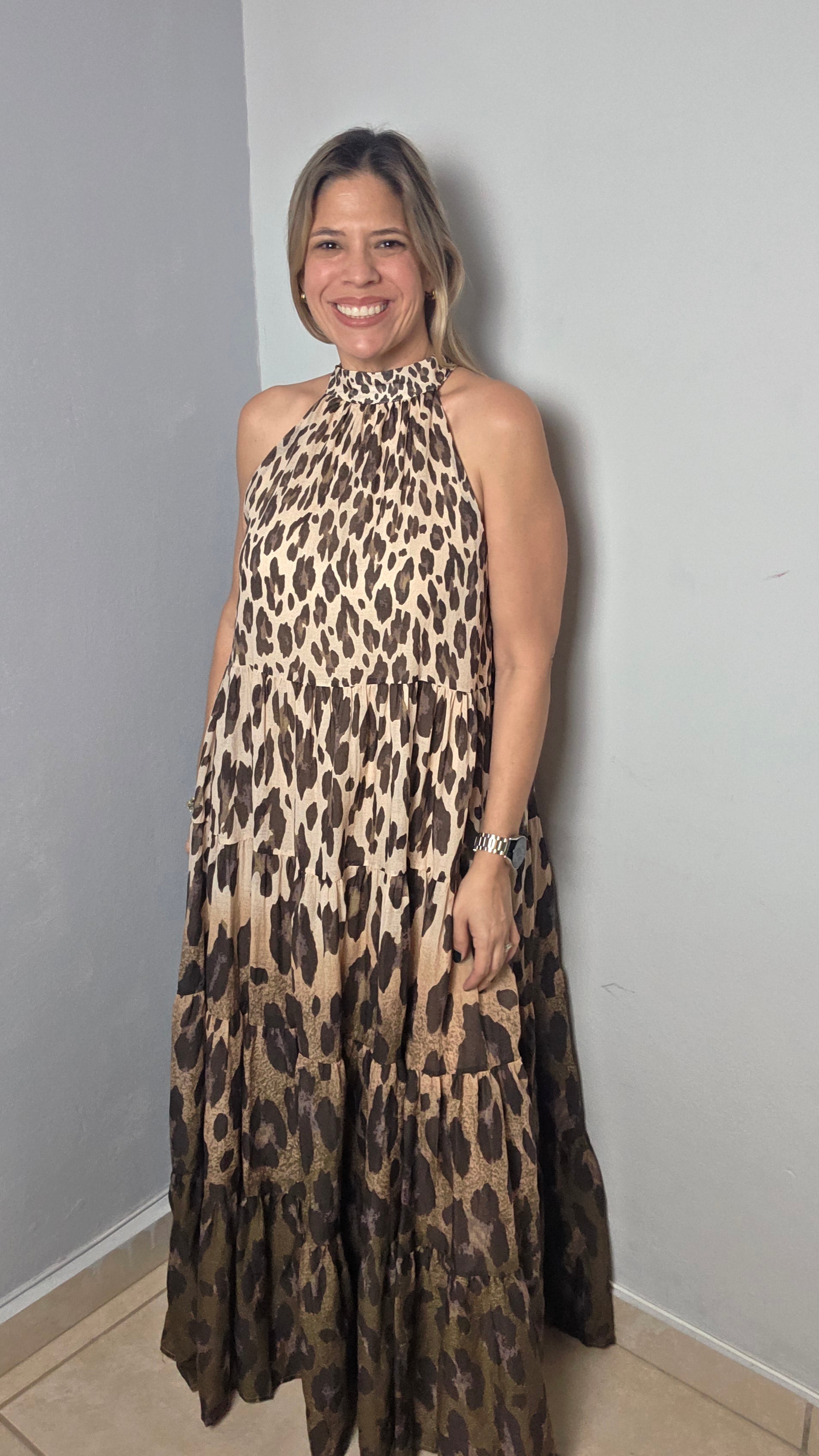 Elevate your wardrobe with this striking animal print maxi dress, designed for effortless sophistication. The halter neckline frames the shoulders beautifully while the tiered skirt creates graceful movement with every step. A delicate back neck tie adds an unexpected touch of elegance. Crafted from 100% cotton, this breathable piece offers comfort without compromising on style, making it perfect for warm-weather occasions or layered styling.