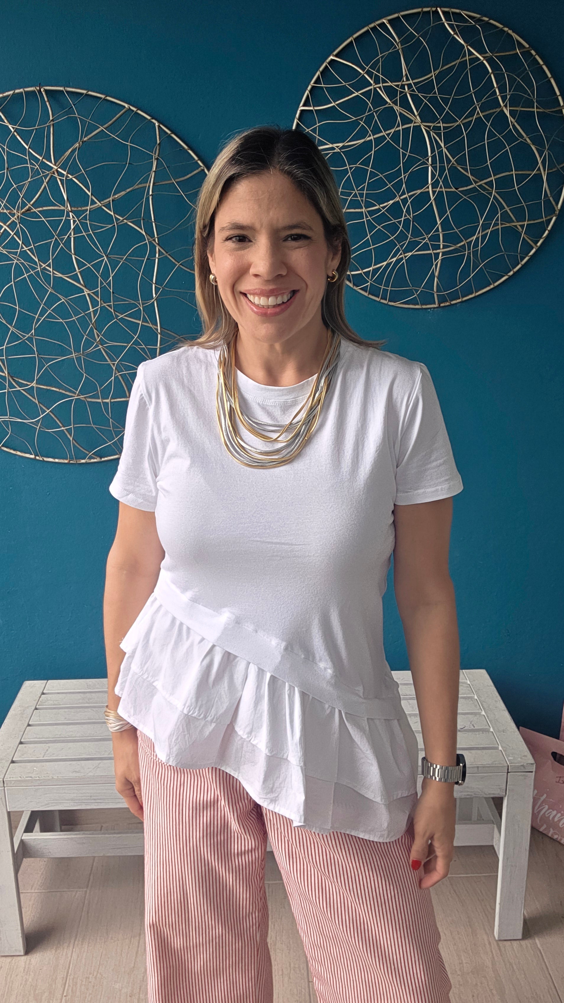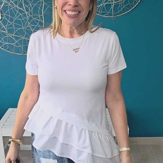 The Creta Top combines comfort and style with its soft 95% cotton and 5% spandex blend, ensuring a flattering stretch throughout the day. The elegant ruffle detail at the bottom adds a feminine touch that sets you apart effortlessly. Perfect for any occasion, this top is a must-have addition to your wardrobe for a look that's both chic and comfortable. Don’t miss out on the chance to wear something truly special.