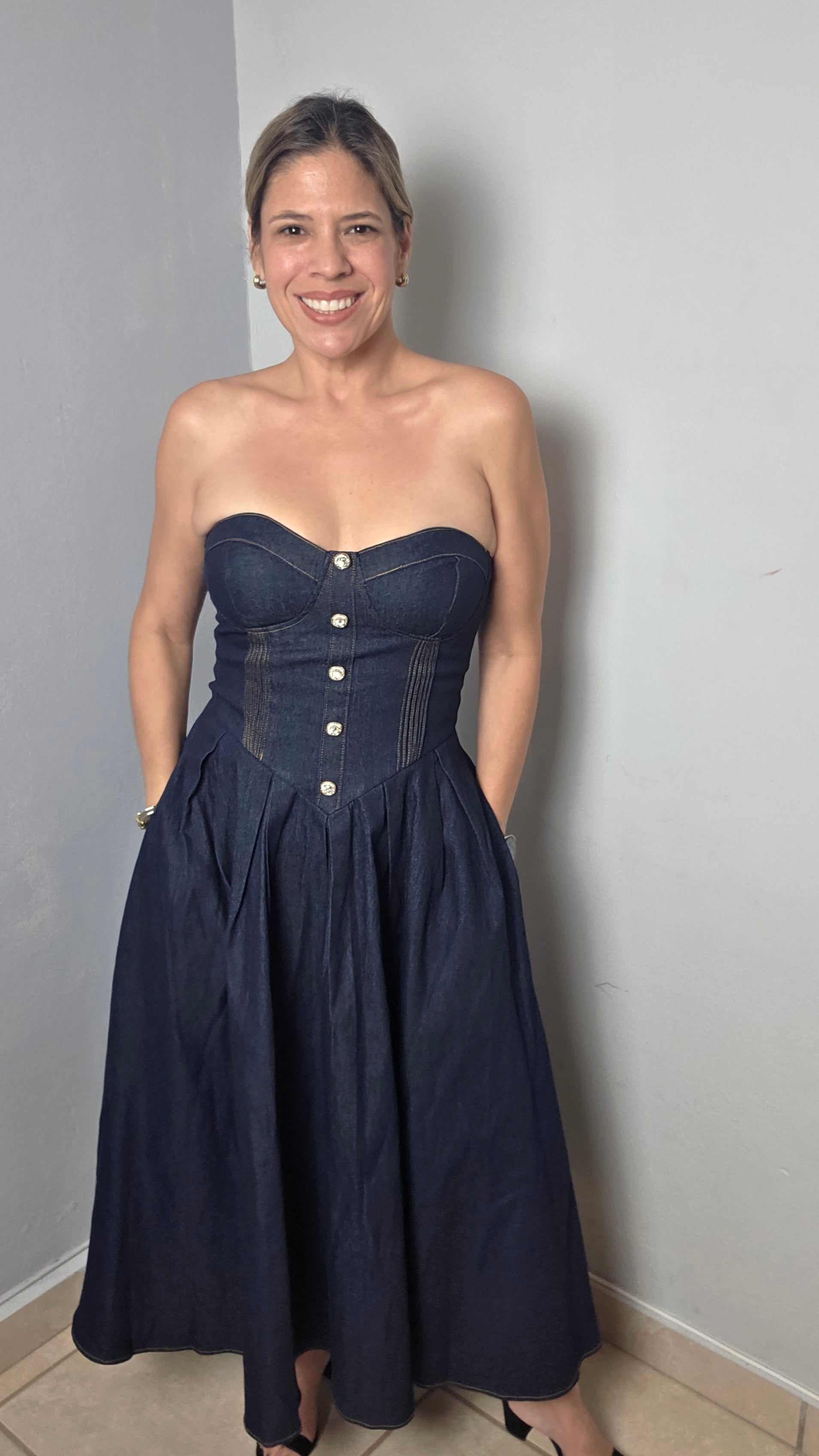 Discover the Diamond Denim Dress—the wardrobe essential that transforms any occasion. Its romantic strapless sweetheart neckline and sculpted bustier bodice with refined button accents create an undeniably flattering silhouette that celebrates your figure. The cinched basque waist flows into a luxurious full skirt, delivering movement and elegance in every step. Made from a breathable 90% cotton and 10% polyester blend, this midi dress offers comfort without compromise. Whether you're dressing up for an evening out or elevating your everyday style, this versatile piece delivers sophistication that never goes out of style. Experience the confidence that comes with looking and feeling your absolute best.