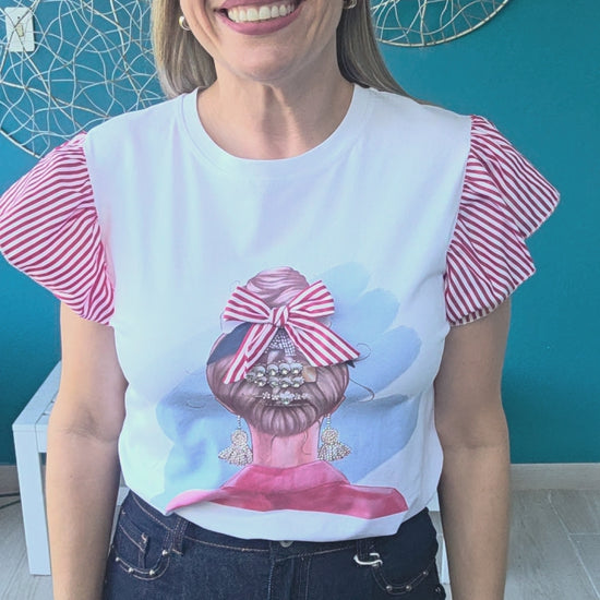The Laia Shirt brings European elegance to your wardrobe with its refined design. This versatile piece accommodates sizes up to large, featuring striking red striped sleeves and a coordinating red striped bow that adds a touch of playful sophistication. Delicate rhinestone details elevate the look, catching light with every movement. Perfect for those who appreciate understated luxury with a distinctive edge.
