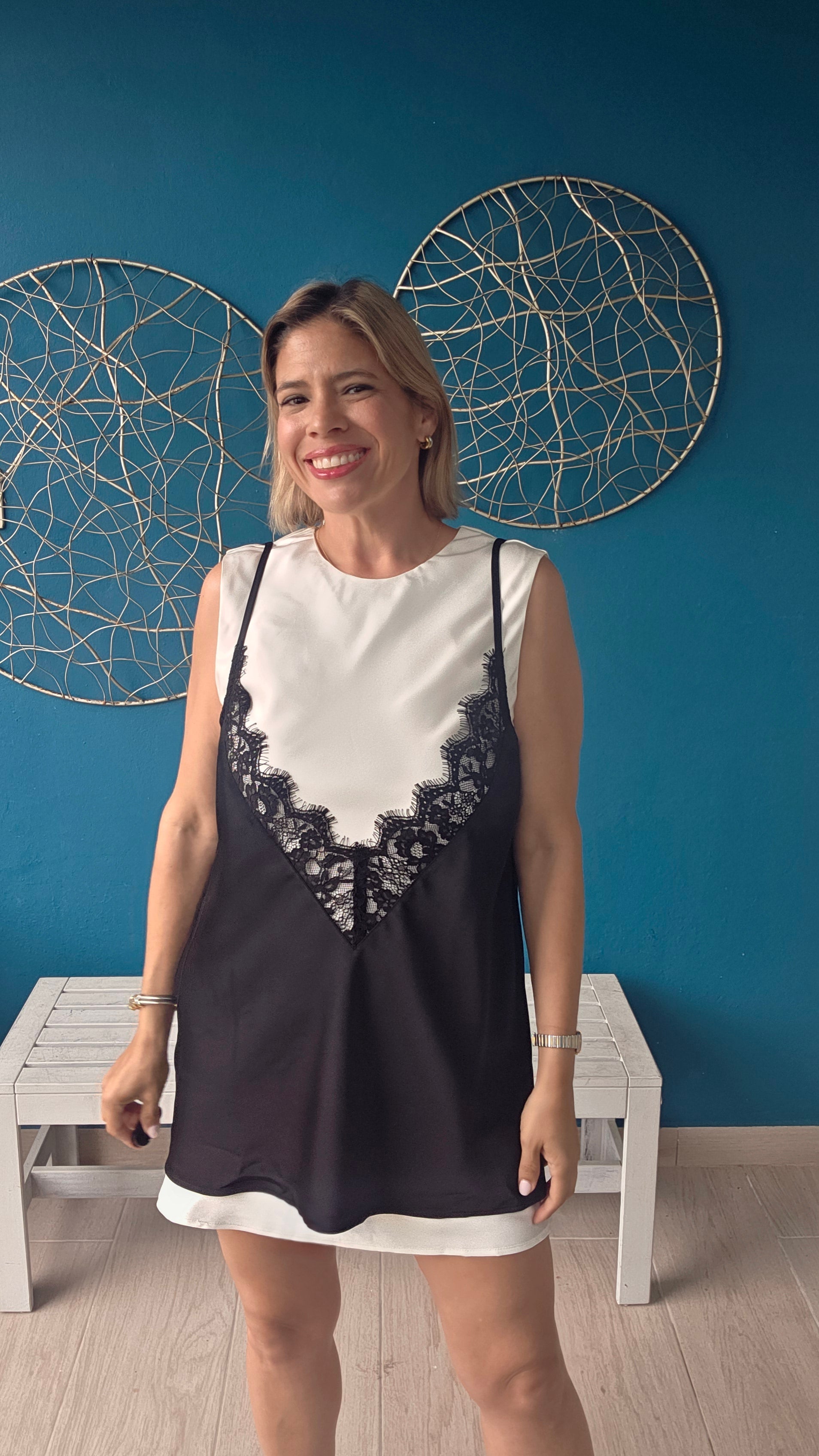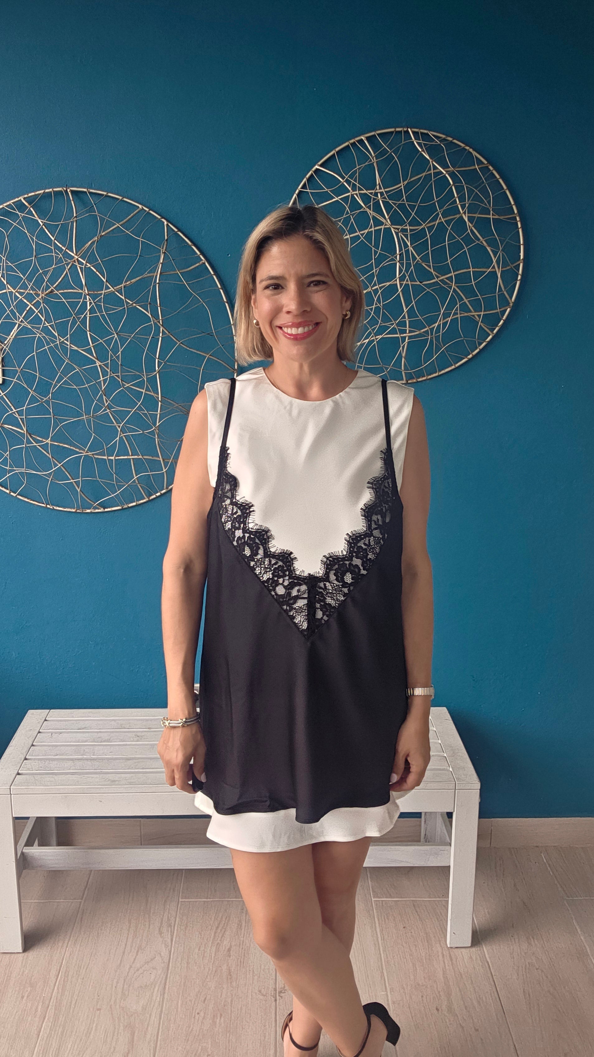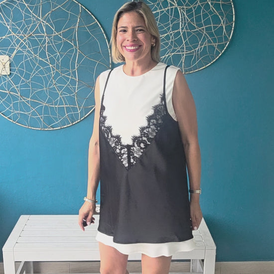 Sleeveless mini dress with an elegant contrast lace trim overlay slip design. Features a clean round neckline and a sophisticated back keyhole with button closure for easy wear. Fully lined for comfort and coverage. Perfect for elevated casual occasions or layered styling.