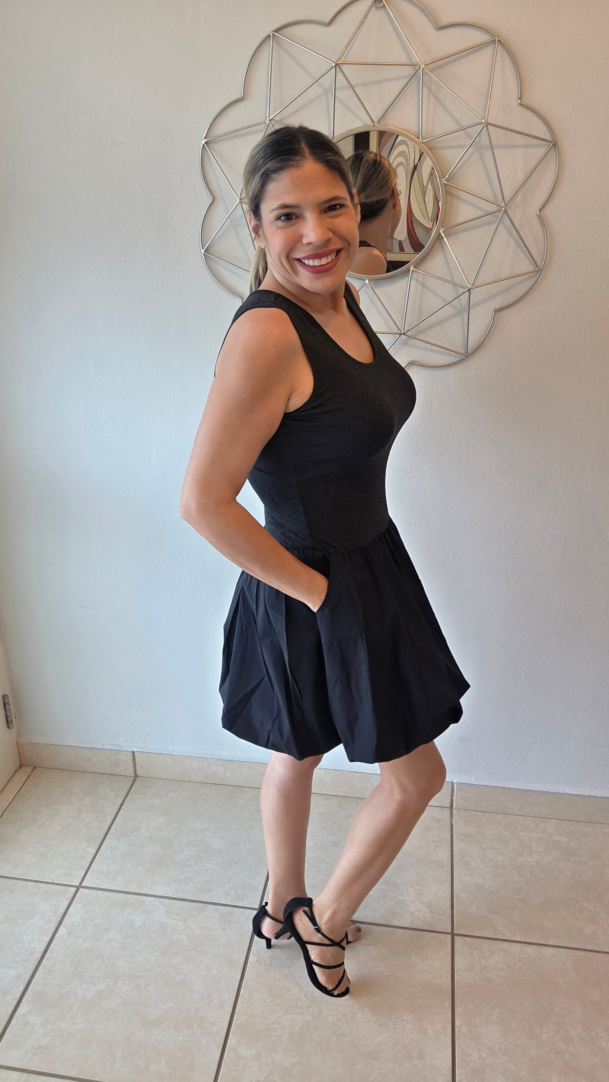 Elevate your event wardrobe with this chic bubble skirt mini dress that effortlessly transitions from cocktail hour to brunch. The fitted jersey knit bodice pairs beautifully with a structured woven bubble skirt for a flattering two-tone silhouette. Sleeveless styling keeps things breezy, while hidden pockets add practical charm. Crafted from luxurious rayon-spandex blend and Tencel, this dress moves with you all night long. Perfect for date nights, celebrations, and those moments when you want to feel absolutely fabulous.