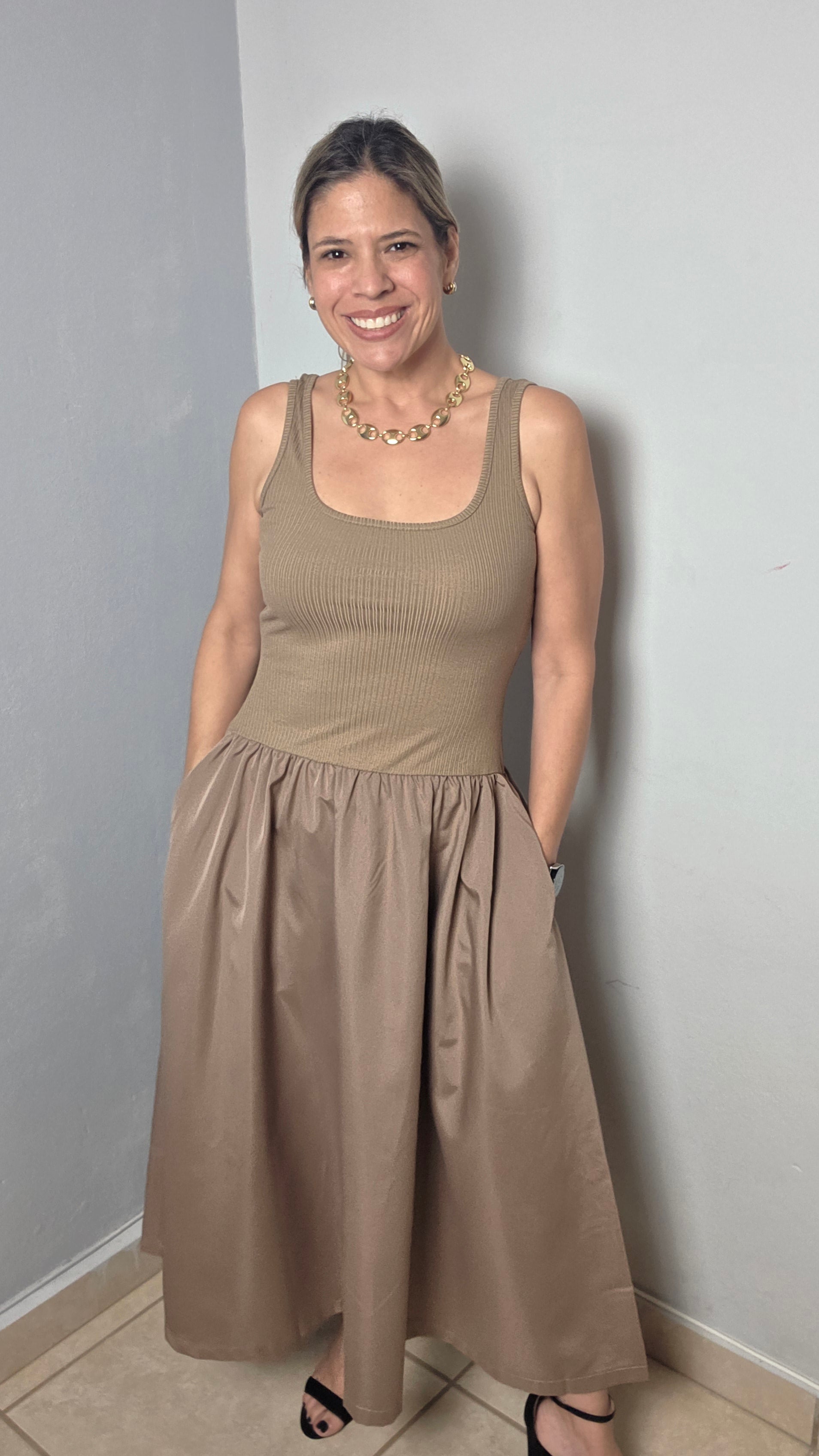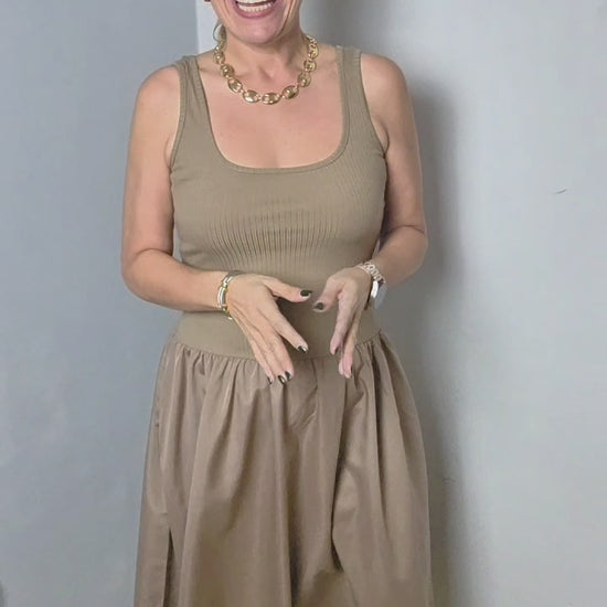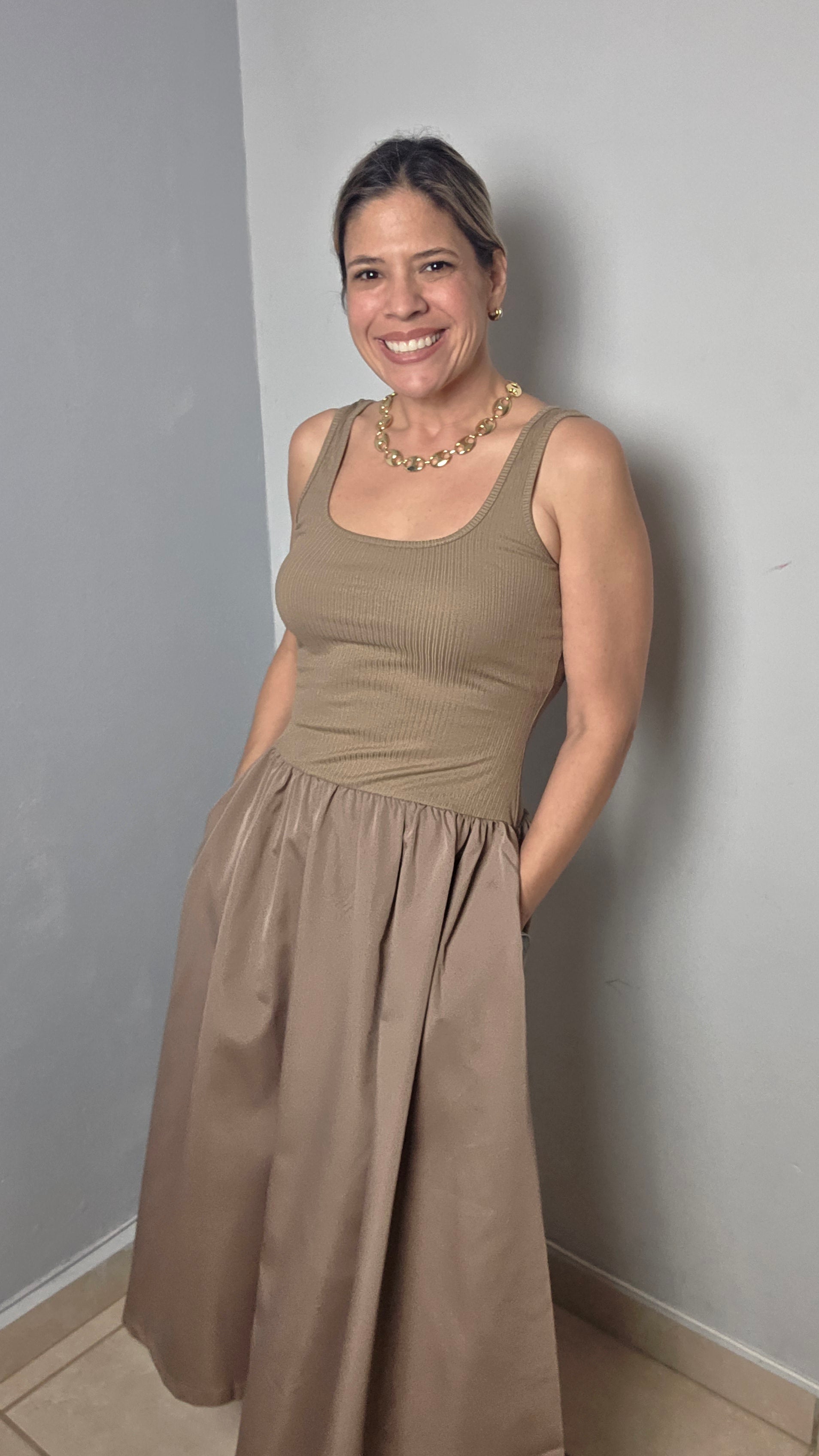 The Maddie Dress combines refined elegance with comfortable versatility. This midi silhouette features a fitted ribbed tank bodice that provides gentle support, paired with a gracefully dropped waistline that flatters the figure. The full poplin skirt creates beautiful movement and dimension. Crafted from a quality knit and woven polyester blend, this dress transitions effortlessly from daytime occasions to evening events. A timeless piece designed for the modern woman who values both style and ease.