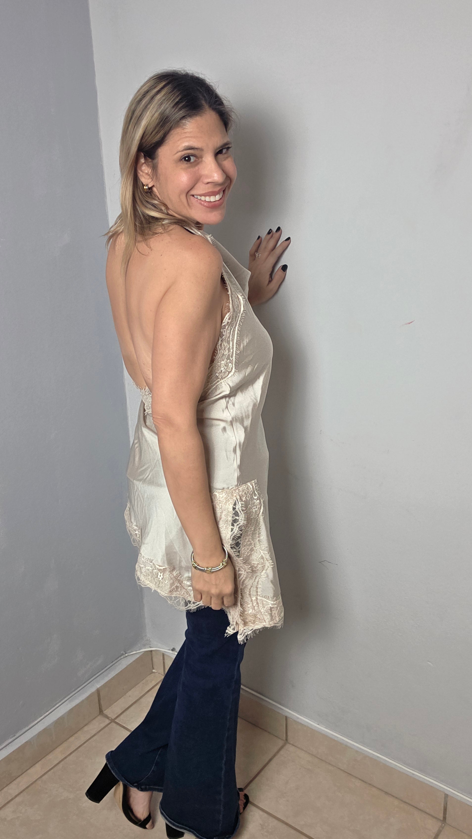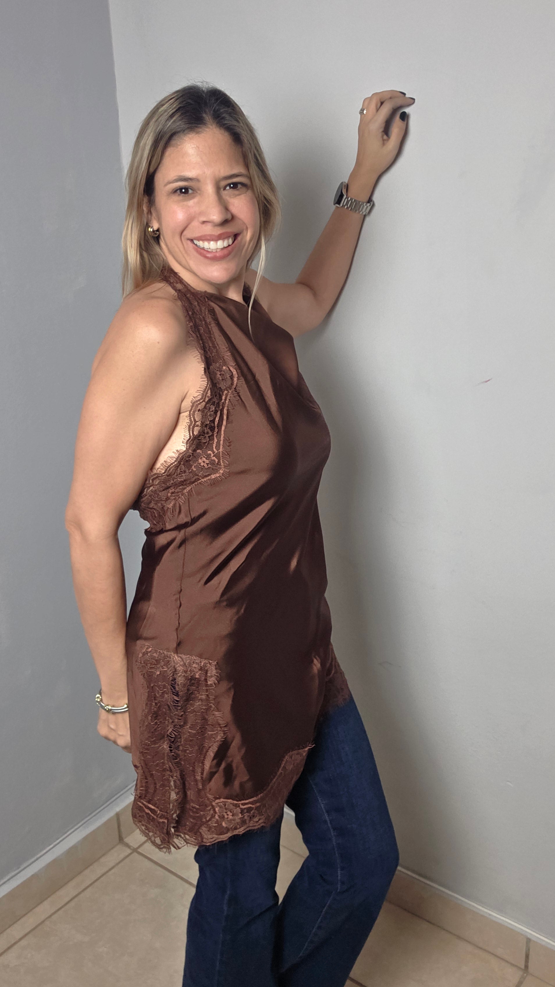Made in italy. One size fits up to medium. Lace satin Experience luxury and elegance with our Satin Lace Asymmetrical Halter Top. Handmade in Italy for superior quality, this one size fits up to medium top features a beautiful lace satin design and a daringly open back. Feel confident, stylish, and sophisticated in this unique and versatile piece.halter asymmetrical top. Open back.