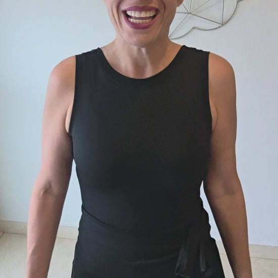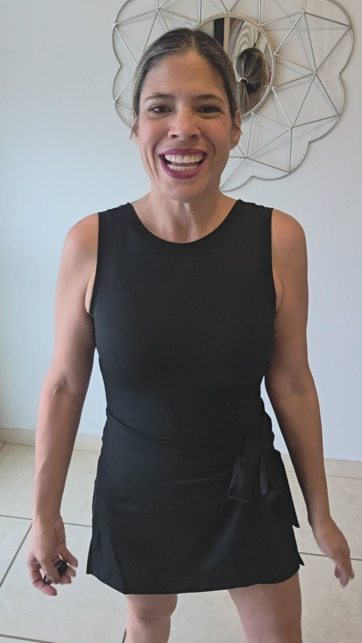 Elevate your game—on the court or off! The Tiana Dress Skort combines sleek style with serious functionality. This premium yoga fabric romper features a flattering sleeveless design paired with covered skorts and hidden under-shorts, complete with a convenient right-side pocket. The adjustable front belt tie transforms it from athletic essential to effortlessly chic, making it perfect for tennis, golf, or everyday adventures. Whether you're serving aces or sipping lattes, you'll feel confident and comfortable in this versatile powerhouse piece.